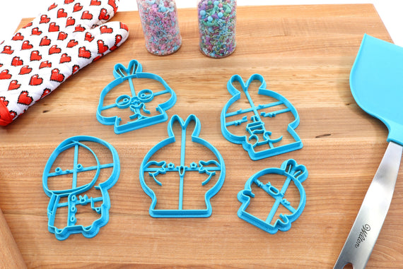 Cute Bunnies Moods Cookie Cutters - Thinking Bunny, Rain Coat Bunny, Peace Sign Bunny, Boba Bunny, Baby Bunny