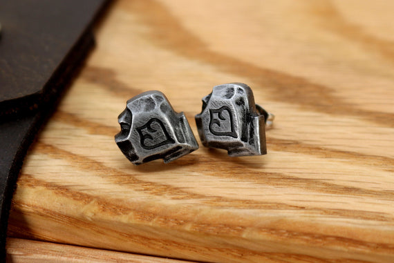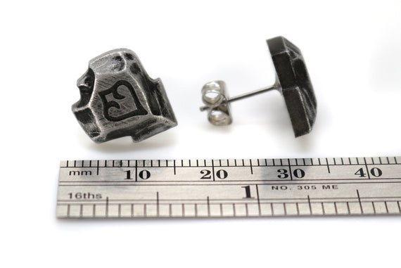 Each of our earrings is hand crafted with quality and care as our main priority. They start out as hand sculpted models that are then molded and cast with a special crystal resin and metal powder mix. This cast is then cleaned and aged using a method that brings out the design out to a shiny finish and leaves the piece with an antiqued feel. Each one is cleaned and secured to hypoallergenic stainless steel studs using super strong adhesive, leaving the finish piece lightweight and durable!