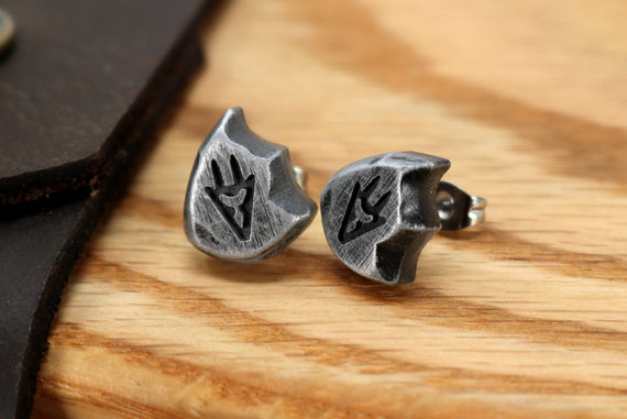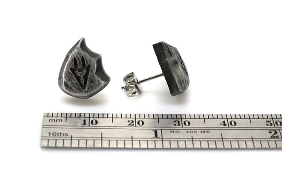 Each of our earrings is hand crafted with quality and care as our main priority. They start out as hand sculpted models that are then molded and cast with a special crystal resin and metal powder mix. This cast is then cleaned and aged using a method that brings out the design out to a shiny finish and leaves the piece with an antiqued feel. Each one is cleaned and secured to hypoallergenic stainless steel studs using super strong adhesive, leaving the finish piece lightweight and durable!