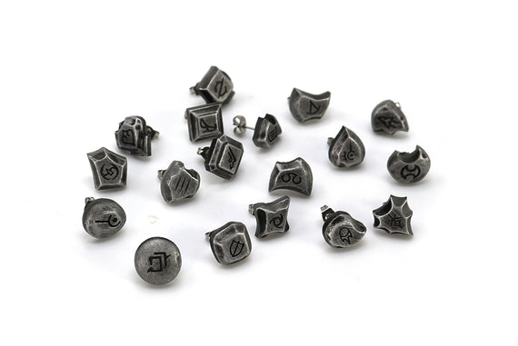 Each of our earrings is hand crafted with quality and care as our main priority. They start out as hand sculpted models that are then molded and cast with a special crystal resin and metal powder mix. This cast is then cleaned and aged using a method that brings out the design out to a shiny finish and leaves the piece with an antiqued feel. Each one is cleaned and secured to hypoallergenic stainless steel studs using super strong adhesive, leaving the finish piece lightweight and durable!