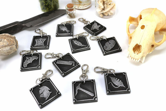Each of our keychains are hand crafted with quality and care as our main priority. They start out as hand sculpted models that are then molded and cast with a special crystal resin and metal powder mix. This cast is then cleaned and aged using a method that brings out the design out to a shiny finish and leaves the piece with an antiqued feel. Each one is cleaned and secured to a hypoallergenic necklace or key chain using super strong adhesive, leaving the finish piece lightweight and durable!